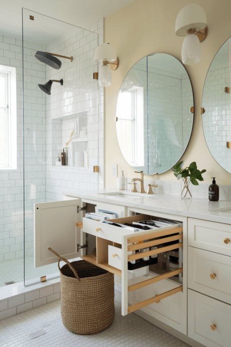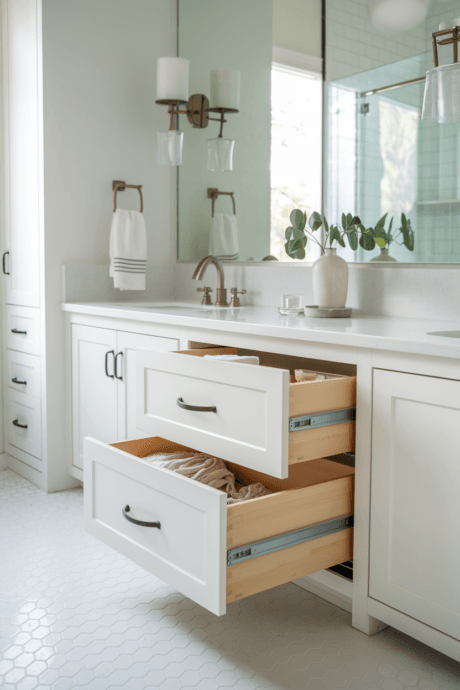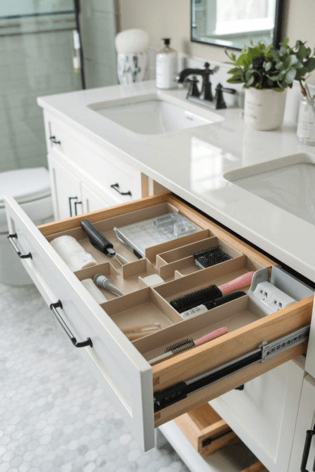 Install drawer systems with integrated LED lighting that automatically illuminates when opened. This innovative solution transforms dark cabinet interiors into perfectly lit storage spaces where every item is instantly visible. The motion-activated lights eliminate the frustration of searching through shadowy drawers, making your morning routine more efficient. This technology can be retrofitted into existing drawers with adhesive LED strips and small battery packs or incorporated into new custom cabinetry for a seamless look. The improved visibility dramatically enhances the functionality of your storage.