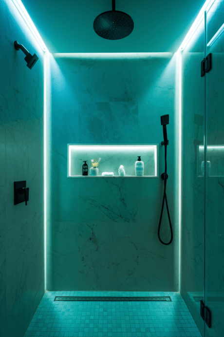 Incorporate a built-in shower niche with waterproof LED lighting around or within the recess. This illuminated storage solution creates dedicated space for shower products while adding dramatic ambient lighting to your shower area. The integrated lighting transforms a practical storage space into an architectural feature that enhances the overall bathroom atmosphere. Choose colored LEDs for a spa-like glow or bright white for better visibility. This solution eliminates the need for hanging caddies or cluttered shower corners while adding luxurious design elements.