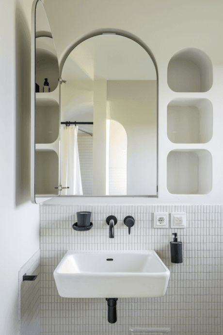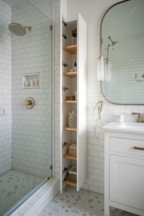 Install a hinged mirror that swings open to reveal shallow shelving built into the wall cavity behind. This concealed storage solution maintains the clean lines of your bathroom while providing substantial hidden space for medications, skincare products, and personal items you’d prefer to keep private. When closed, it appears as a standard bathroom mirror, but swings open like a cabinet door when needed. This recessed solution maximizes wall space without protruding into your limited bathroom square footage.