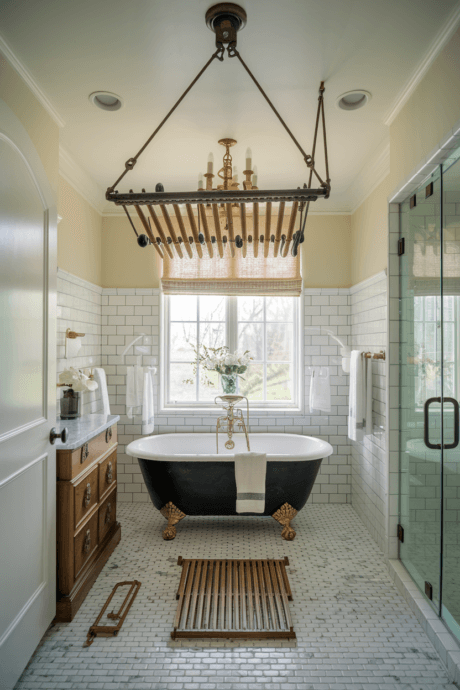 Install a vintage-inspired ceiling-mounted drying rack that can be raised and lowered via a pulley system. This clever solution utilizes the unused space near your ceiling for hanging wet towels or delicate garments. When not needed, raise it back to the ceiling to keep floor and wall space clear. Choose oil-rubbed bronze hardware for traditional bathrooms or stainless steel for contemporary spaces. This old-world solution brings practical function with distinctive character that becomes an architectural feature in your small bathroom.