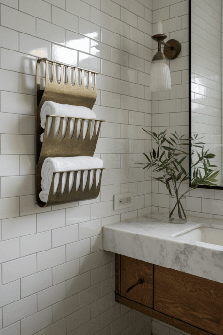 Mount wooden or metal magazine racks vertically on your bathroom wall to create distinctive storage for rolled towels. The slots designed for magazines perfectly cradle rolled bath towels, keeping them accessible while showcasing their colors and textures as a decorative element. Install multiple racks in a row for greater capacity, or stagger them artistically for visual interest. This repurposed solution combines practical storage with a design-forward aesthetic that elevates your bathroom’s style while utilizing otherwise unused wall space.