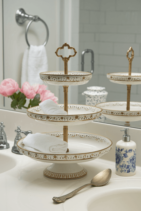 Repurpose a decorative tiered cake stand as an elegant bathroom counter organizer for small essentials. The elevated design creates distinct zones for different items—perfume bottles on top, makeup in the middle, and larger items on the bottom tier—while maintaining a small footprint. Choose a stand in materials that complement your bathroom aesthetic—ceramic for traditional spaces, metal for industrial, or glass for contemporary. This unexpected storage piece adds vertical organization with a touch of sophistication not found in standard bathroom organizers.