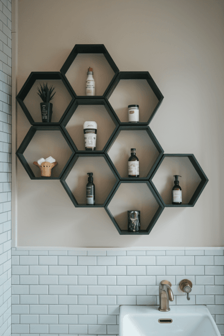 Create a honeycomb-inspired storage display with interconnected hexagonal wall shelves. The geometric arrangement offers individualized compartments for various bathroom essentials while functioning as modern wall art. Arrange the hexagons in an organic pattern, varying the depth of some shelves to accommodate different sized items. Paint all shelves in a single color for a cohesive look, or use a gradient of complementary shades for visual interest. This contemporary storage solution brings architectural personality to plain bathroom walls while providing practical organization.