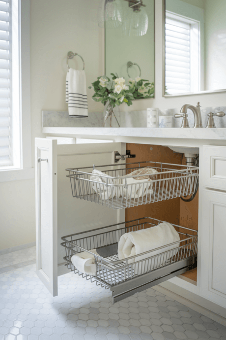 Maximize the awkward space beneath your bathroom sink with a custom pull-out sliding basket system. Install drawer slides on the cabinet floor and sides, then attach wire or plastic baskets that glide smoothly in and out. This solution brings everything into view and reach, eliminating the frustration of items lost at the back of deep cabinets. Group similar items in each basket for easy access—cleaning supplies in one, hair tools in another. The sliding mechanism transforms previously unusable cabinet depths into perfectly accessible storage.