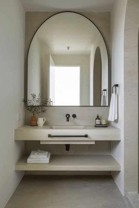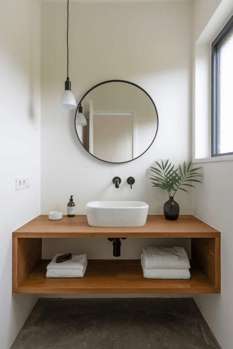 Choose a wall-mounted floating vanity with open shelving beneath to maximize both storage and visual space in your bathroom. The floating design creates the illusion of more floor area, making the bathroom feel larger, while the open shelves below provide accessible storage for baskets of toiletries or stacks of towels. This modern solution works particularly well in contemporary bathrooms where both functionality and clean lines are priorities. Select waterproof materials in light colors to enhance the airy feeling.