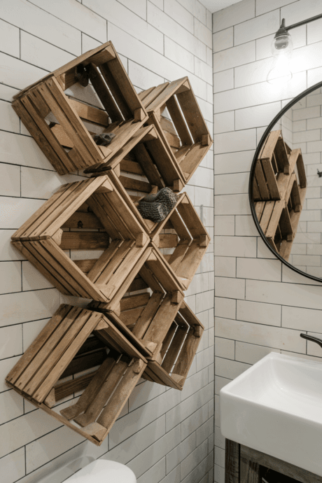 Mount wooden wine crates horizontally on your bathroom wall to create rustic open storage boxes with built-in character. The individual compartments perfectly store rolled towels, toilet paper, or collections of smaller toiletries in decorative containers. Arrange multiple crates in an interesting pattern for greater storage capacity and visual impact. Sand and seal the wood to protect against bathroom humidity, or paint in colors that complement your décor. This upcycled solution combines vintage charm with practical organization at minimal cost.