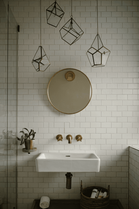 Repurpose glass geometric terrariums as hanging bathroom storage by suspending them from the ceiling or a wall-mounted rod. These transparent containers beautifully display colorful bath salts, decorative soaps, or cotton balls while adding a modern, artistic element to your bathroom. The hanging arrangement utilizes vertical space without consuming precious counter or floor area. Choose various shapes and sizes for visual interest, and hang at staggered heights for a captivating display that combines form and function.