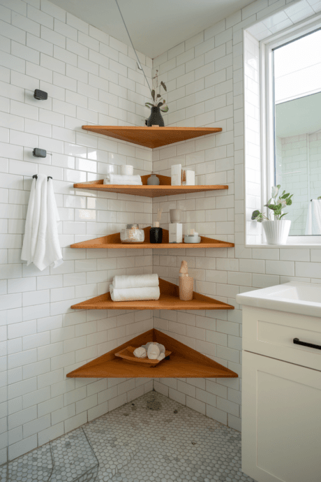 Maximize those often-wasted bathroom corners with a custom floating corner shelf system. These triangular shelves fit perfectly into corners, utilizing space that would otherwise remain empty. Start narrow at the top and gradually widen as you move down for a visually pleasing arrangement. The floating design keeps the floor clear, making cleaning easier while creating the illusion of more space. These shelves work beautifully for displaying decorative items or storing everyday essentials in an otherwise unusable area.