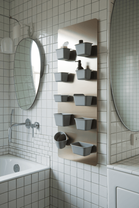 Install a metal backing plate on your bathroom wall to create a customizable magnetic storage system. Attach various magnetic containers, shelves, and hooks that can be rearranged whenever your storage needs change. This flexible solution works beautifully for makeup, skincare products, and small accessories that tend to clutter countertops. Choose containers in coordinating colors for a cohesive look, or mix materials for an eclectic vibe. This system adapts to your changing needs without requiring new installations.
